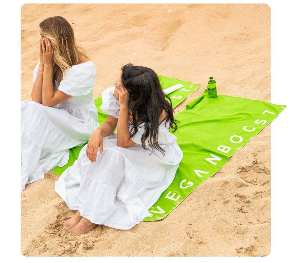 Hi Sunshine! Jouw ultieme strandmaatje is hier. Deze Veganboost beach towel van 70x150 cm is gemaakt van een luxe mix van 88% polyester en 12% polyamide – superlicht, zacht en ideaal om overal mee naartoe te nemen.