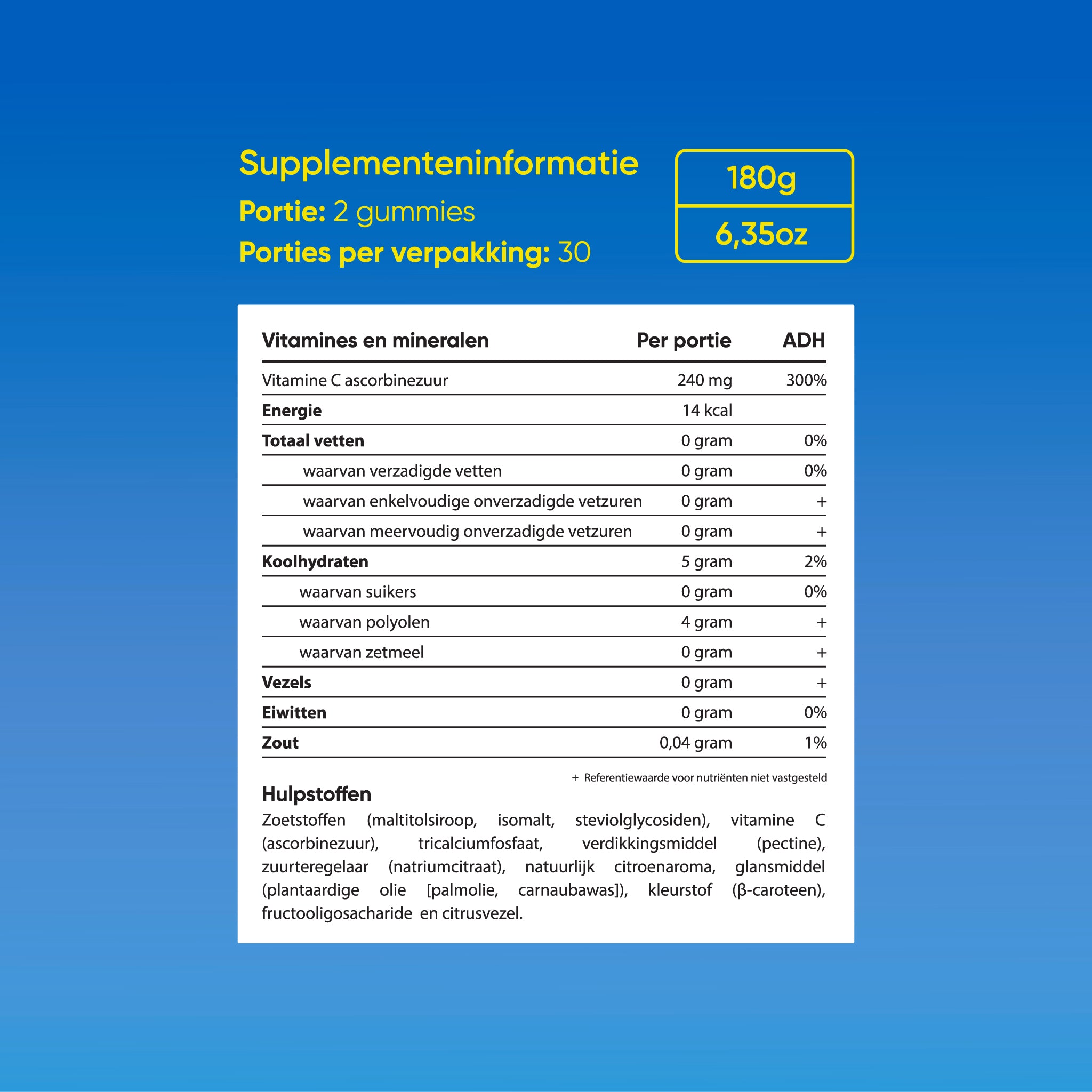 De kauwbare gummies bevatten een hoge dosis vitamine C, een essentiële voedingsstof die ons lichaam zelf niet kan aanmaken, maar met de voeding moet opnemen. Vitamine C ondersteunt het immuunsysteem, bevordert de energiestofwisseling en draagt bij aan de vorming van collageen, wat belangrijk is voor de huid.